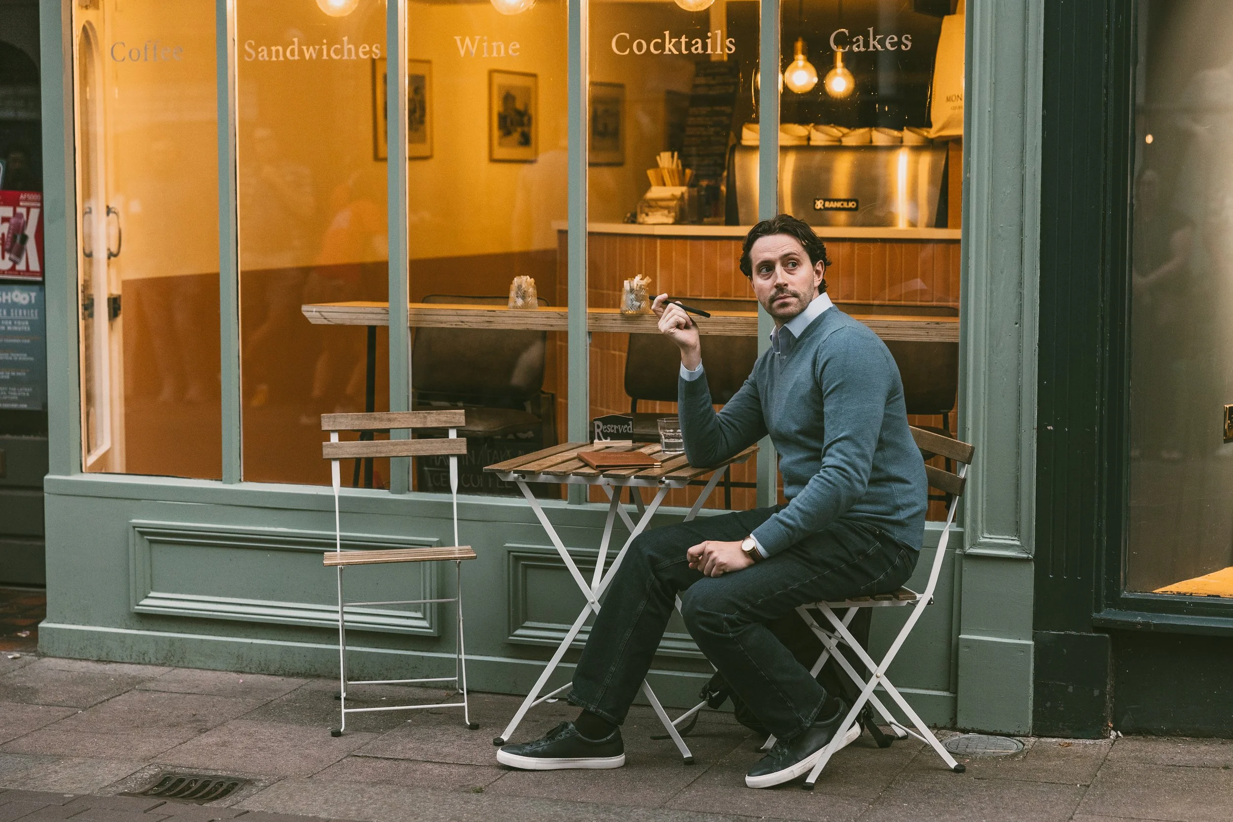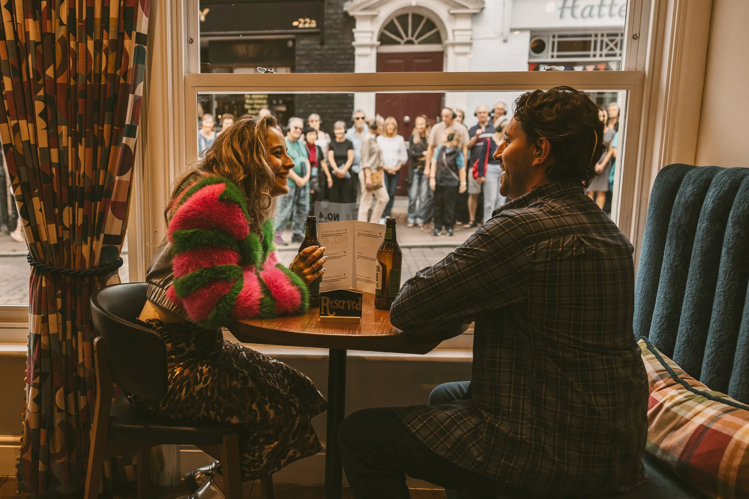 The story is delightfully simple – a chance meeting between a shy, socially awkward guy, Steve and a vivacious, confident, but wayward woman called Steff. They meet, as we the audience do, at an outdoor café and we watch on, and listen through headphones, as the first steps on what will be a bumpy ride of an affair take hold. Steve is in the café waiting for a blind date, Steff is a waitress who spots this nervously reluctant Romeo and moves in before his date arrives. We then follow their journey as they inevitably but awkwardly fall in love. This happens outside the Abbeygate Cinema, inside a shop window, out in a courtyard – and other spots in central Bury. Each stop takes us further into Steve and Steff’s relationship – he is overcoming his gauche mummy’s boy personality, she is finding that the wild child act, what she calls ‘a bubble on the wind’ starts to wear thin. It is a journey of self-discovery for both.