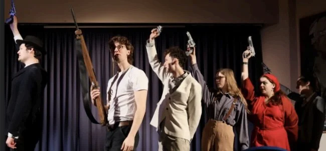 Multiple assassination may not at first seem like a good idea for a musical. But in the hands of Stephen Sondheim and his librettist John Waldman, this is a damn good shot. The show premiered in 1990 and has never been in the first rank of Sondheim productions. It is fairly rarely seen. So bullet-proof hats off to Trinity Hall Musical for putting on ‘Assassins’ in its small lecture theatre. The intimacy of the venue, added an extra charge to what was a hugely enjoyable, high energy, very well acted and sung production. The play with music, envisages a kind of Purgatory for actual and would-be killers of US presidents. They gather in a kind of haunted limbo to egg each other on to commit the gunning down of Lincoln, Garfield, Reagan (survived) and Kennedy. We peer through dialogue and acerbic song into the psyche of the killers: Booth the furious Southerner doing his Brutus to Caeser act, and Lee Harvey Oswald egged on by the assassins of the past.