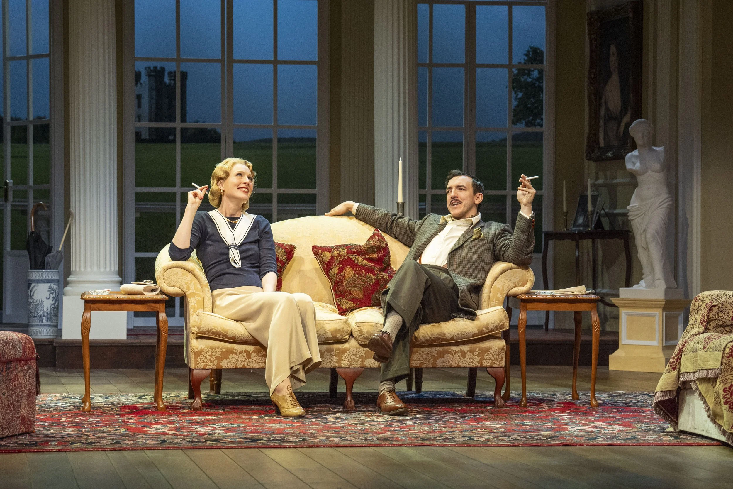We are in a very familiar world – a gorgeously furnished drawing room, the inevitable French windows leading out to the equally predictable tennis court. It was all beautifully conceived on the Arts Theatre stage – a complex arrangement of doors, elegant seating and grand staircase.